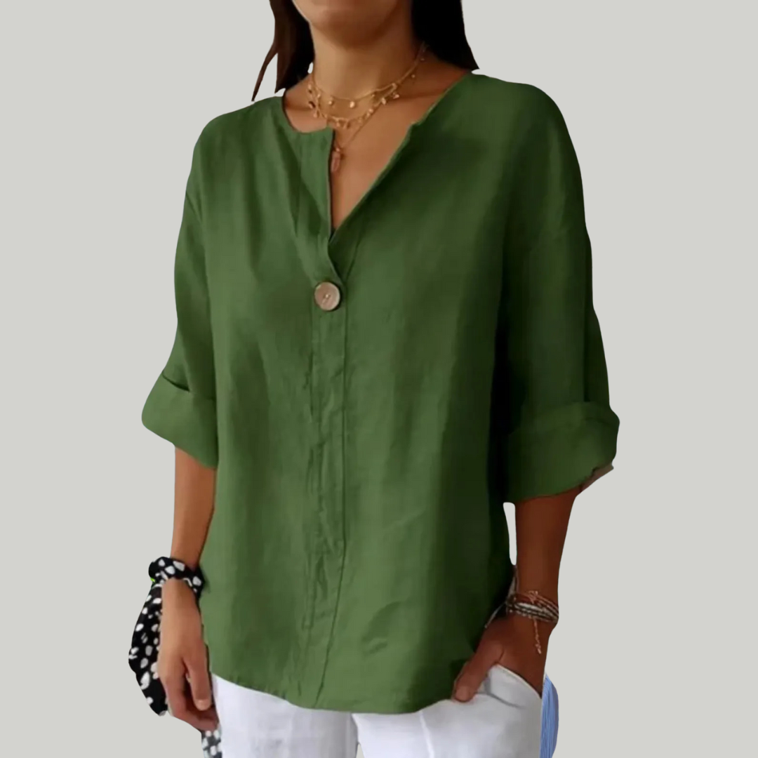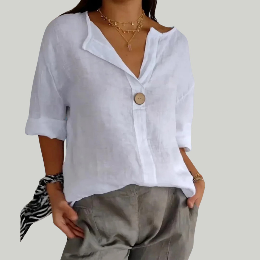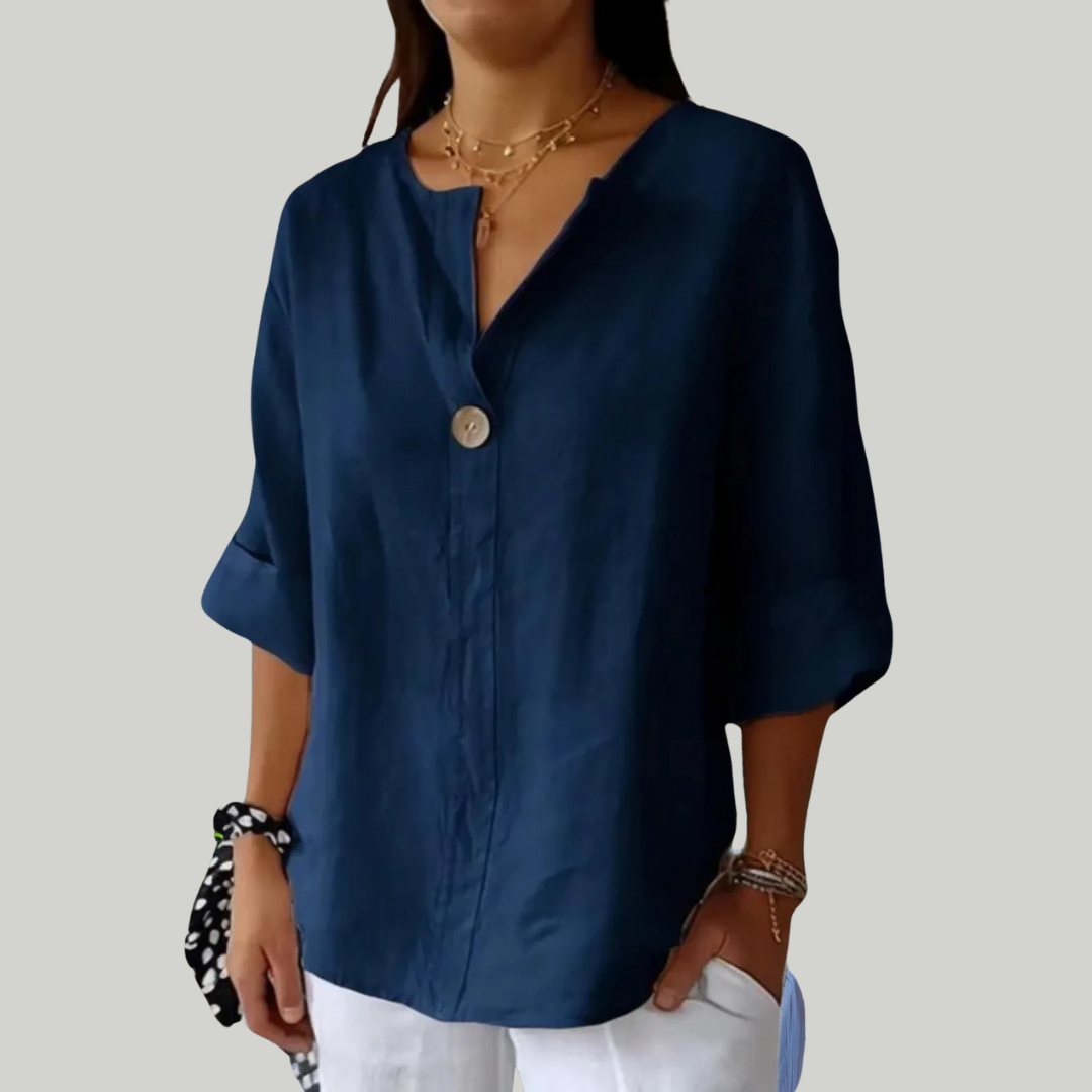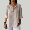 This blouse features a V-neckline, 3/4 sleeves with button cuffs, and a loose fit that allows natural movement. Its simple yet refined design pairs effortlessly with trousers, skirts, or jeans, making it suitable for everyday wear or social gatherings.