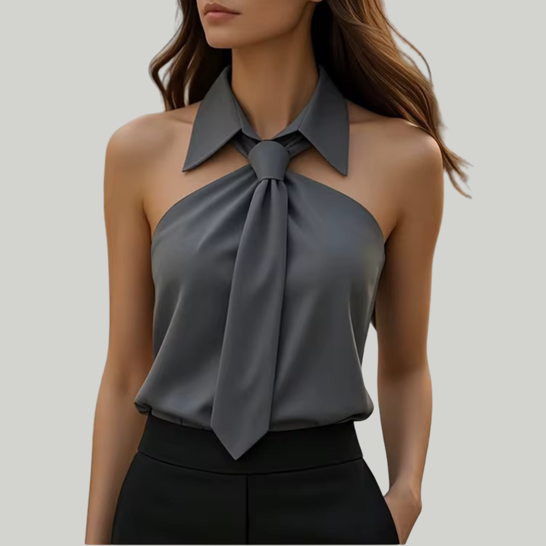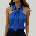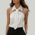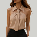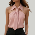 A warm-weather staple designed for ease and style, this sleeveless top blends a halter-inspired neckline with a subtle tie detail that frames the collar. Its lightweight drape makes it an easy match for shorts, skirts, or trousers, giving you flexibility to dress it up or down. Whether for casual outings, office layering, or evening get-togethers, this top adapts to different settings without complication.